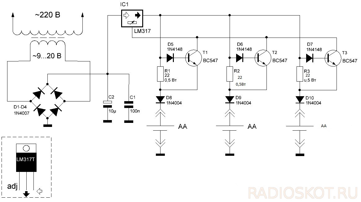 всем привет! мне надо зарядить 8штук АА, нашел схему на LM317 и BC547, можно ее расширить до 8 аккумуляторов, потянит ли LM317 ? еще хотел узнать, каким током надо заряжать аккумулятор если его емкость 1600mAh  Добавлено (16.09.2015, 11:21) ---------------------------------------------
