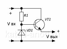 На схеме видно стабилитрон VD1 и резистор R1 подключённые к источнику питания. Резистор подключён к плюсовому выводу, а анод стабилитрона к минусовому выводу источника питания. В точке соединения этих двух элементов напряжение стабилизировано и имеет, в нашем случае, например 5,6 В.